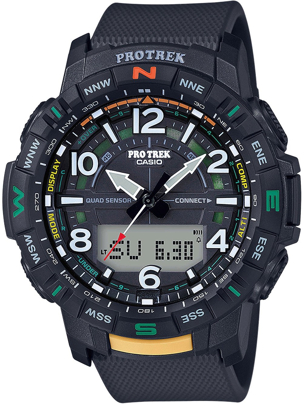 Brand: Casio • Manufacturer no.: PRT-B50-1ER • Manufacturer series: Pro Trek 51mm • Functions: 12-/24 time mode, 5 day alarm, Altimeter, Automatic calender, Barometer, Bluetooth, cold resistant, Compass, Hour, Minute, Pedometer, Phone Finder, Second, Stop function, Sunrise & sunset, Thermometer, Timer, Worldtimer • Movement: Battery (quartz) • Dial color: Black • Display: Analog, Digital • Water resistant: 10 • Bezel: bidirectional, Turnable • Surface finish: Matted • Case color: Black • Case material: Resin • Case thickness: 15 • Case shape: Round • Case width: 51 • Caseback: pressed, Stainless steel bottom • Gender: Mens • Glas: hardened, Mineral glass • Lighting: Illuminator • Style: Sporty • Strap material: Resin • Strap color: Black • Lug width: 23 • Clasp: Buckle clasp • Max wrist circumferences: 230 • Item weight: 0.07 • Scope of delivery: Box, Instruction, Packaging, Warranty documents"