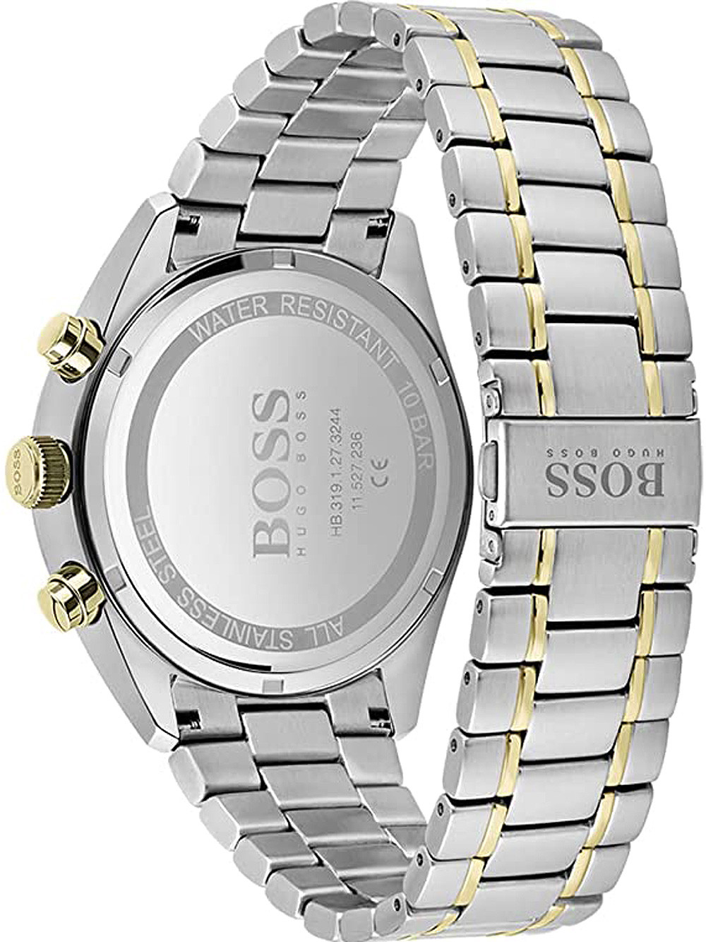 Brand: Hugo Boss • Manufacturer no.: 1513878 • Manufacturer series: Champion Chronograph 44mm • Functions: 24-hours, Chronograph, Date, Hour, Minute, Second • Movement: Battery (quartz) • Dial color: Green • Display: Analog • Water resistant: 10 • Bezel: Fixed • Surface finish: Matted, Polished • Case color: Silver • Case material: Stainless steel • Case thickness: 12 • Case shape: Round • Case width: 44 • Caseback: screwed, Stainless steel bottom • Gender: Mens • Glas: hardened, Mineral glass • Lighting: Illumin. hands • Style: Sporty • Strap material: Stainless steel • Strap color: Gold, Silver • Lug width: 22 • Clasp: Folding clasp • Max wrist circumferences: 190 • Item weight: 0.15 • Scope of delivery: Box, Instruction, Packaging, Warranty documents"