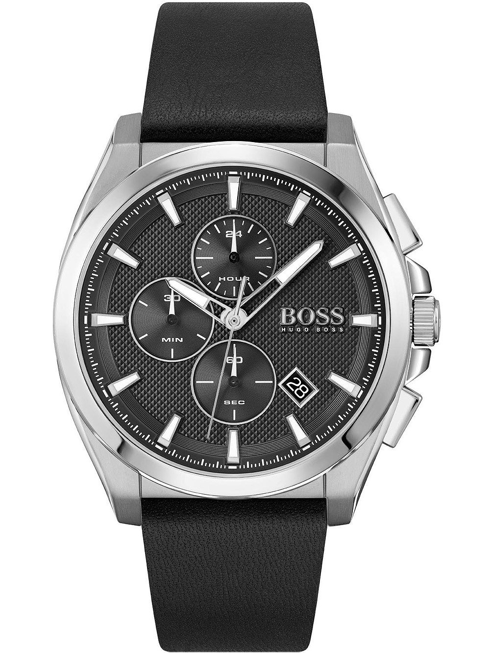 Brand: Hugo Boss • Manufacturer no.: 1513881 • Manufacturer series: Grandmaster Chronograph 47mm • Functions: 24-hours, Chronograph, Date, Hour, Minute, Second • Movement: Battery (quartz) • Dial color: Black • Display: Analog • Water resistant: 5 • Bezel: Fixed • Surface finish: Matted, Polished • Case color: Silver • Case material: Stainless steel • Case thickness: 13 • Case shape: Round • Case width: 47 • Caseback: screwed, Stainless steel bottom • Gender: Mens • Glas: hardened, Mineral glass • Lighting: Illumin. hands, Illumin. indexes • Style: Sporty • Strap material: Calf leather • Strap color: Black • Lug width: 24 • Clasp: Buckle clasp • Max wrist circumferences: 225 • Item weight: 0.10 • Scope of delivery: Box, Instruction, Packaging, Warranty documents"