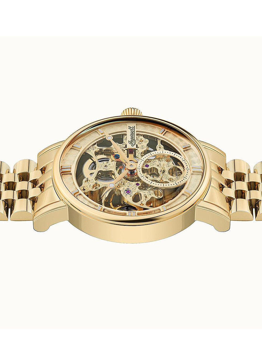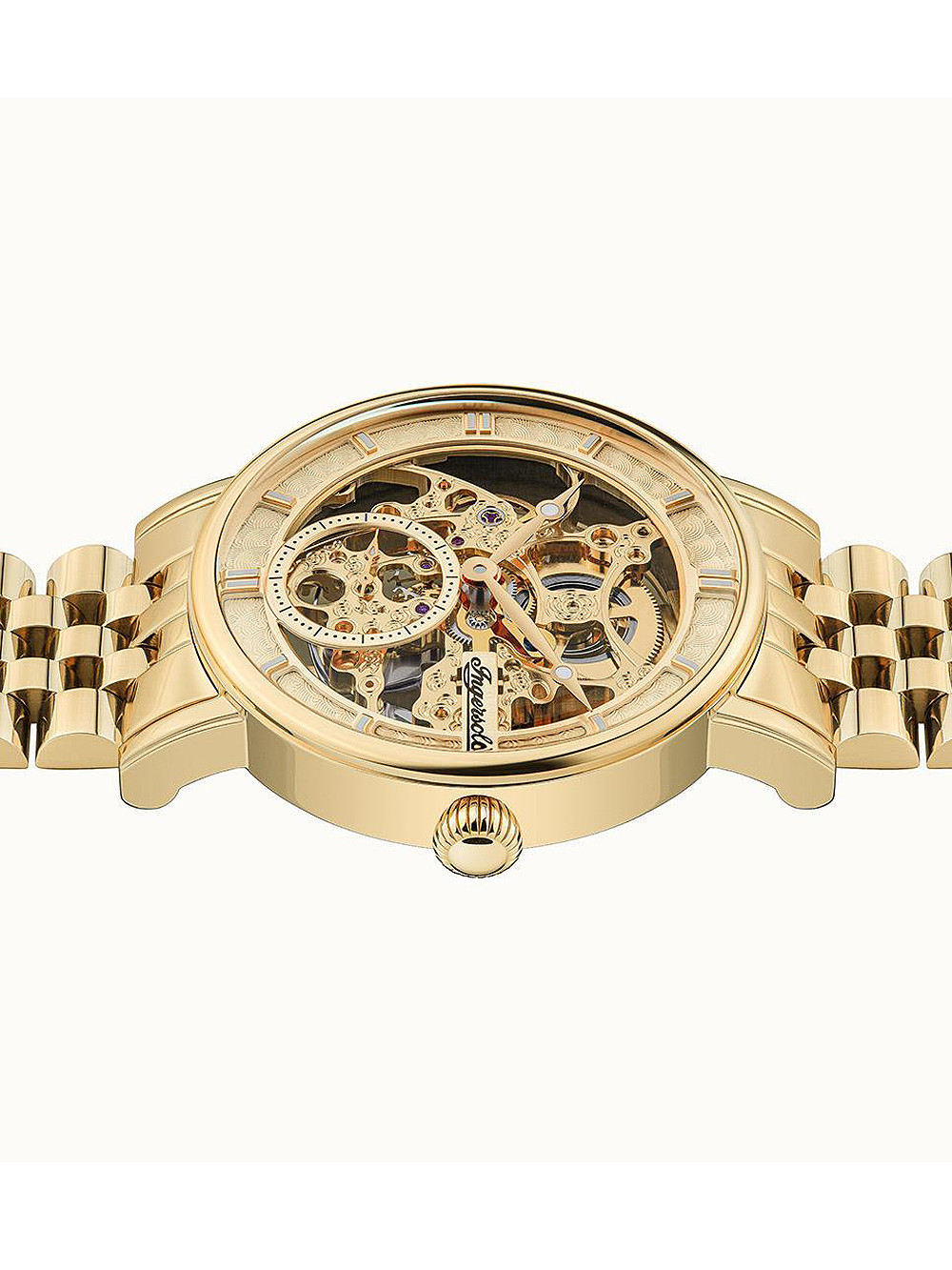 Brand: Ingersoll • Manufacturer no.: I00408 • Manufacturer series: The Herald automatic 40mm I00408 • Functions: Hour, Minute, Second • Movement: Automatic • Dial color: Golden • Display: Analog • Water resistant: 5 • Bezel: Fixed • Surface finish: Polished • Case color: Gold • Case material: Stainless steel • Case thickness: 14 • Case shape: Round • Case width: 40 • Caseback: Glas bottom, screwed • Gender: Mens • Glas: hardened, Mineral glass • Lighting: Illumin. hands, Illumin. indexes • Style: Classic • Strap material: Stainless steel • Strap color: Gold • Lug width: 20 • Clasp: Butterfly clasp • Max wrist circumferences: 210 • Item weight: 0.12 • Scope of delivery: Box, Instruction, Packaging, Warranty documents"
