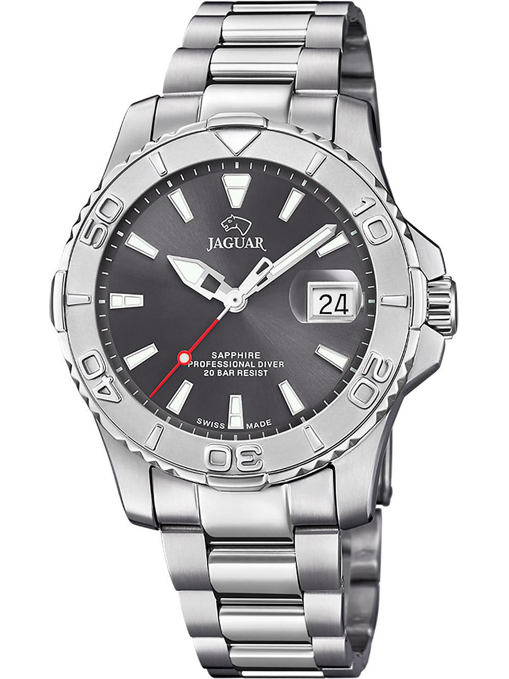 • Manufacturer no.: J969/3 • Manufacturer series: Executive Diver 40mm • Functions: Date, Hour, Minute, Second • Movement: Battery (quartz) • Dial color: Grey • Display: Analog • Water resistant: 20 • Bezel: counterclockwise, Turnable • Surface finish: Matted, Polished • Case color: Silver • Case material: Stainless steel • Case thickness: 12 • Case width: 40 • Caseback: screwed, Stainless steel bottom • Gender: Mens • Crown: Screwed • Glas: anti-reflecting, Saphire glass • Lighting: Illumin. hands, Illumin. indexes • Style: Sporty • Strap material: Stainless steel • Strap color: Silver • Lug width: 20 • Clasp: Folding clasp • Max wrist circumferences: 205 • Item weight: 0.16 • Scope of delivery: Box, Instruction, Packaging, Warranty documents