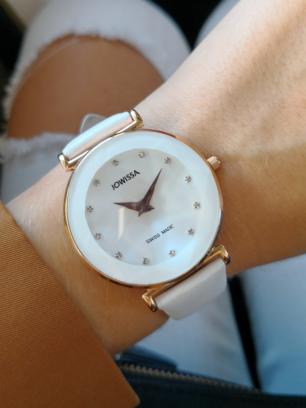 • Manufacturer no.: J5.545.L • Manufacturer series: Facet 36mm • Functions: Hour, Minute • Movement: Battery (quartz) • Movement label: Swiss Made • Dial color: White • Display: Analog • Water resistant: 3 • Bezel: Fixed • Surface finish: Polished • Case color: Rosé gold • Case material: Stainless steel • Case thickness: 9 • Case shape: Round • Case trimming: Zirconia • Case width: 36 • Caseback: screwed, Stainless steel bottom • Gender: Ladies • Glas: hardened, Mineral glass • Style: Elegant • Strap material: Calf leather • Strap color: white • Lug width: 18 • Clasp: Buckle clasp • Max wrist circumferences: 205 • Item weight: 0.04 • Scope of delivery: Box, Instruction, Packaging, Warranty documents
