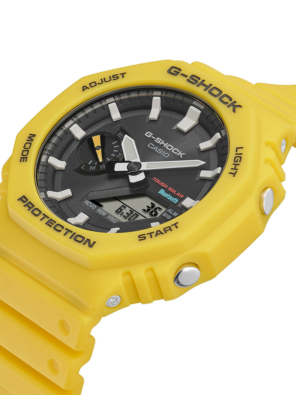 Brand: Casio • Manufacturer no.: GA-B2100C-9AER • Manufacturer series: G-Shock solar 46mm • Functions: 12-/24 time mode, 5 day alarm, Automatic calender, Bluetooth, Date, Hour, Minute, Phone Finder, Second, Shock resistant, Solar, Stop function, Timer, Worldtimer • Movement: Solar (quartz) • Dial color: Black • Display: Analog & digital • Water resistant: 20 • Bezel: Fixed • Surface finish: Matted • Case color: Yellow • Case material: Resin • Case thickness: 12 • Case shape: Round • Case width: 46 • Caseback: screwed, Stainless steel bottom • Gender: Mens • Glas: hardened, Mineral glass • Lighting: Super-Illuminator • Style: Sporty • Strap material: Resin • Strap color: Yellow • Lug width: 25 • Clasp: Buckle clasp • Max wrist circumferences: 220 • Item weight: 0.05 • Scope of delivery: Box, Instruction, Packaging, Warranty documents"