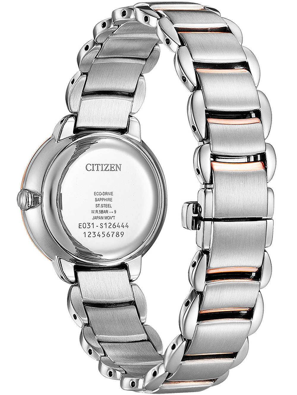 • Manufacturer no.: EM0924-85Y • Manufacturer series: Eco-Drive Elegance 28mm • Functions: Hour, Minute, Second, Solar • Movement: Solar (quartz) • Movement label: Citizen, E031 • Dial color: Mother of pearl, Pink • Display: Analog • Water resistant: 5 • Bezel: Fixed • Surface finish: Matted, Polished • Case color: Rosé gold, Silver • Case material: Stainless steel • Case thickness: 8 • Case trimming: Zirconia • Case width: 28 • Caseback: pressed, Stainless steel bottom • Gender: Ladies • Glas: anti-reflecting, Saphire glass • Style: Elegant • Strap material: Stainless steel • Strap color: Rosé gold, Silver • Lug width: 10 • Clasp: Butterfly clasp • Max wrist circumferences: 180 • Item weight: 0.07 • Scope of delivery: Box, Instruction, Packaging, Warranty documents