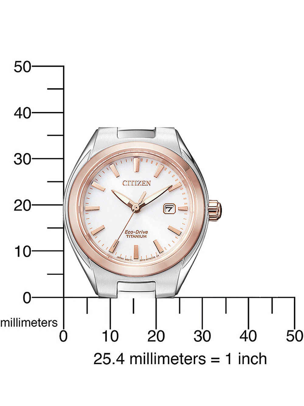 • Manufacturer no.: EW2616-83A • Manufacturer series: Eco-Drive Titanium 31mm • Functions: Date, Hour, Minute, Second, Solar • Movement: Solar (quartz) • Movement label: Citizen, E013 • Dial color: White • Display: Analog • Water resistant: 10 • Bezel: Fixed • Surface finish: Matted, Polished • Case color: Rosé gold, Silver • Case material: Titanium • Case thickness: 9 • Case width: 31 • Caseback: screwed, Titanium bottom • Gender: Ladies • Glas: anti-reflecting, Saphire glass • Lighting: Illumin. hands • Style: Classic • Strap material: Titanium • Strap color: Rosé gold, Silver • Lug width: 16 • Clasp: Folding clasp • Max wrist circumferences: 180 • Item weight: 0.05 • Scope of delivery: Box, Instruction, Packaging, Warranty documents