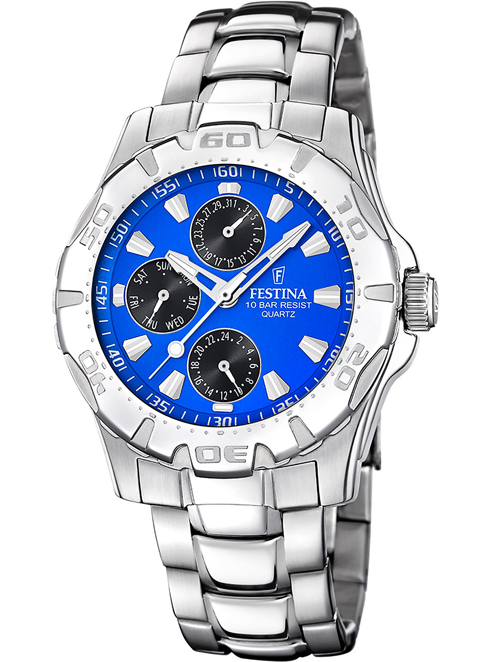 Brand: Festina • Manufacturer no.: F16242/J • Manufacturer series: Sport 40mm • Functions: 24-hours, Date, Day, Hour, Minute, Second • Movement: Battery (quartz) • Dial color: Blue • Display: Analog • Water resistant: 10 • Bezel: Fixed • Surface finish: Matted, Polished • Case color: Silver • Case material: Stainless steel • Case thickness: 14 • Case shape: Round • Case width: 40 • Caseback: screwed, Stainless steel bottom • Gender: Mens • Glas: hardened, Mineral glass • Lighting: Illumin. hands, Illumin. indexes • Style: Sporty • Strap material: Stainless steel • Strap color: Silver • Lug width: 21 • Clasp: Folding clasp • Max wrist circumferences: 195 • Item weight: 0.16 • Scope of delivery: Box, Instruction, Packaging, Warranty documents"