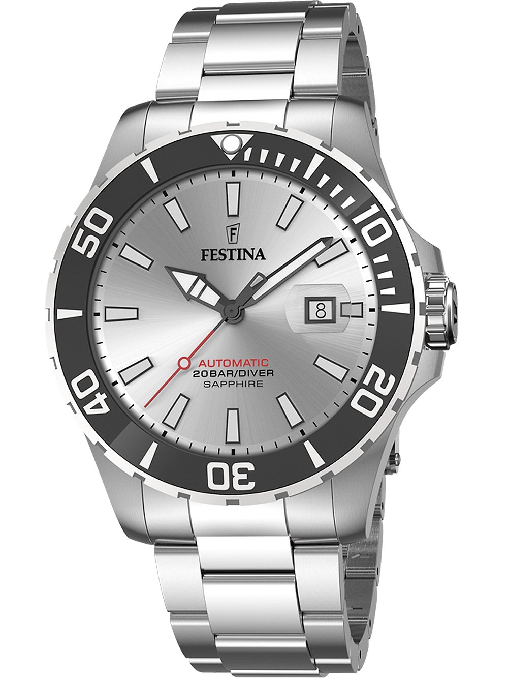 Brand: Festina • Manufacturer no.: F20531/1 • Manufacturer series: Diver automatic 44mm • Functions: Date, Hour, Minute, Second • Movement: Automatic • Dial color: Silver • Display: Analog • Water resistant: 20 • Bezel: counterclockwise, Turnable • Surface finish: Matted, Polished • Case color: Silver • Case material: Stainless steel • Case thickness: 14 • Case shape: Round • Case width: 44 • Caseback: screwed, Stainless steel bottom • Gender: Mens • Crown: Screwed • Glas: anti-reflecting, Saphire glass • Lighting: Illumin. hands, Illumin. indexes • Style: Sporty • Strap material: Stainless steel • Strap color: Silver • Lug width: 22 • Clasp: Folding clasp • Max wrist circumferences: 200 • Item weight: 0.18 • Scope of delivery: Box, Instruction, Packaging, Warranty documents"