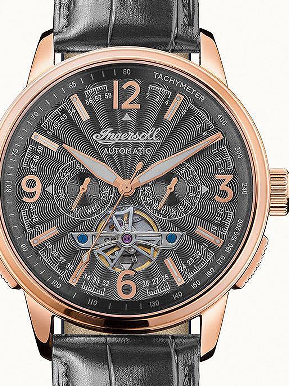 Brand: Ingersoll • Manufacturer no.: I00302B • Manufacturer series: The Regent automatic 47mm I00302B • Functions: Date, Day, Hour, Minute, Second • Movement: Automatic • Dial color: Grey • Display: Analog • Water resistant: 5 • Bezel: Fixed • Surface finish: Matted, Polished • Case color: Rosé gold • Case material: Stainless steel • Case thickness: 17 • Case shape: Round • Case width: 47 • Caseback: Glas bottom, screwed • Gender: Mens • Glas: hardened, Mineral glass • Lighting: Illumin. hands, Illumin. indexes • Style: Classic • Strap material: Calf leather • Strap color: Grey • Lug width: 24 • Clasp: Buckle clasp • Max wrist circumferences: 230 • Item weight: 0.12 • Scope of delivery: Box, Instruction, Packaging, Warranty documents"