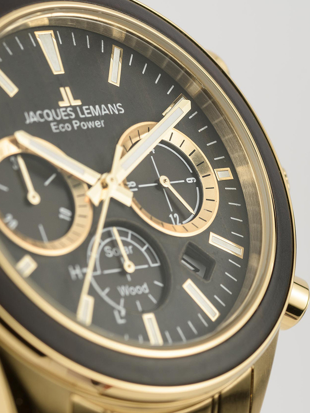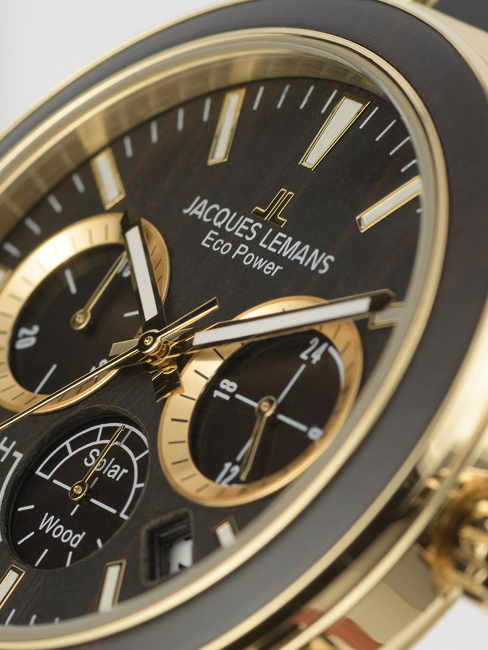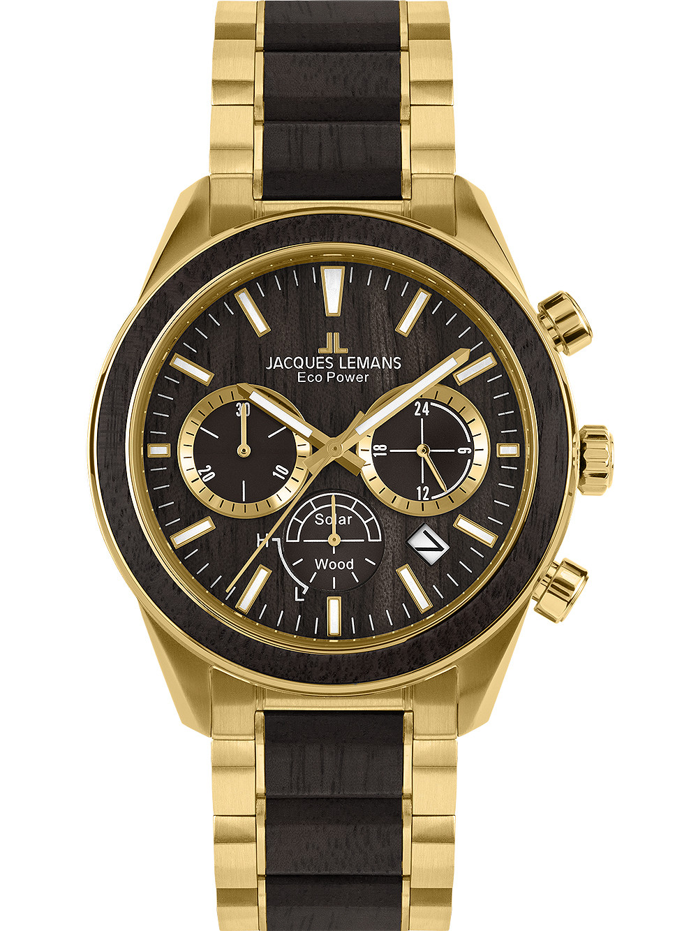 • Manufacturer no.: 1-2115L • Manufacturer series: Eco Power 44mm • Functions: 24-hours, Chronograph, Date, Hour, Minute, Second • Movement: Solar (quartz) • Dial color: Brown • Display: Analog • Water resistant: 10 • Bezel: Fixed • Surface finish: Matted, Polished • Case color: Gold • Case material: Stainless steel • Case thickness: 12 • Case shape: Round • Case width: 44 • Caseback: screwed, Stainless steel bottom • Gender: Mens • Glas: hardened, Mineral glass • Lighting: Illumin. hands, Illumin. indexes • Style: Sporty • Strap material: Stainless steel, Wood • Strap color: Brown, Gold • Lug width: 22 • Clasp: Folding clasp • Max wrist circumferences: 190 • Item weight: 0.14