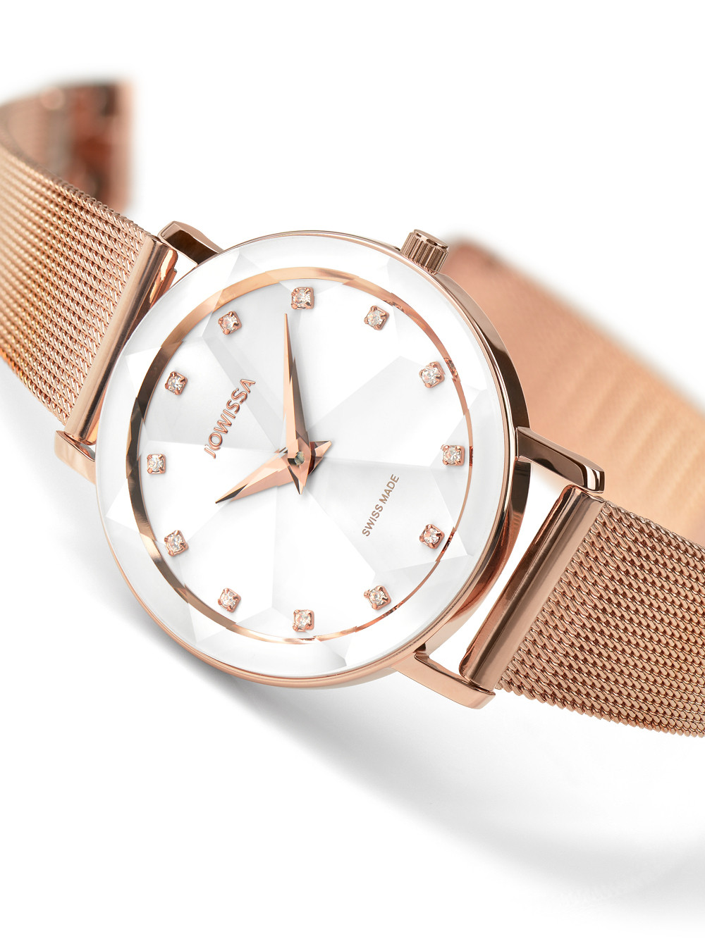 • Manufacturer no.: J5.610.M • Manufacturer series: Facet 30mm • Functions: Hour, Minute • Movement: Battery (quartz) • Movement label: Swiss Made • Dial color: White • Display: Analog • Water resistant: 5 • Bezel: Fixed • Surface finish: Polished • Case color: Rosé gold • Case material: Stainless steel • Case thickness: 10 • Case shape: Round • Case trimming: Zirconia • Case width: 30 • Caseback: pressed, Stainless steel bottom • Gender: Ladies • Glas: hardened, Mineral glass • Style: Elegant • Strap material: Stainless steel • Strap color: Rosé gold • Lug width: 15 • Clasp: Clip clasp • Max wrist circumferences: 195 • Item weight: 0.04 • Scope of delivery: Box, Instruction, Packaging, Warranty documents