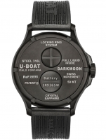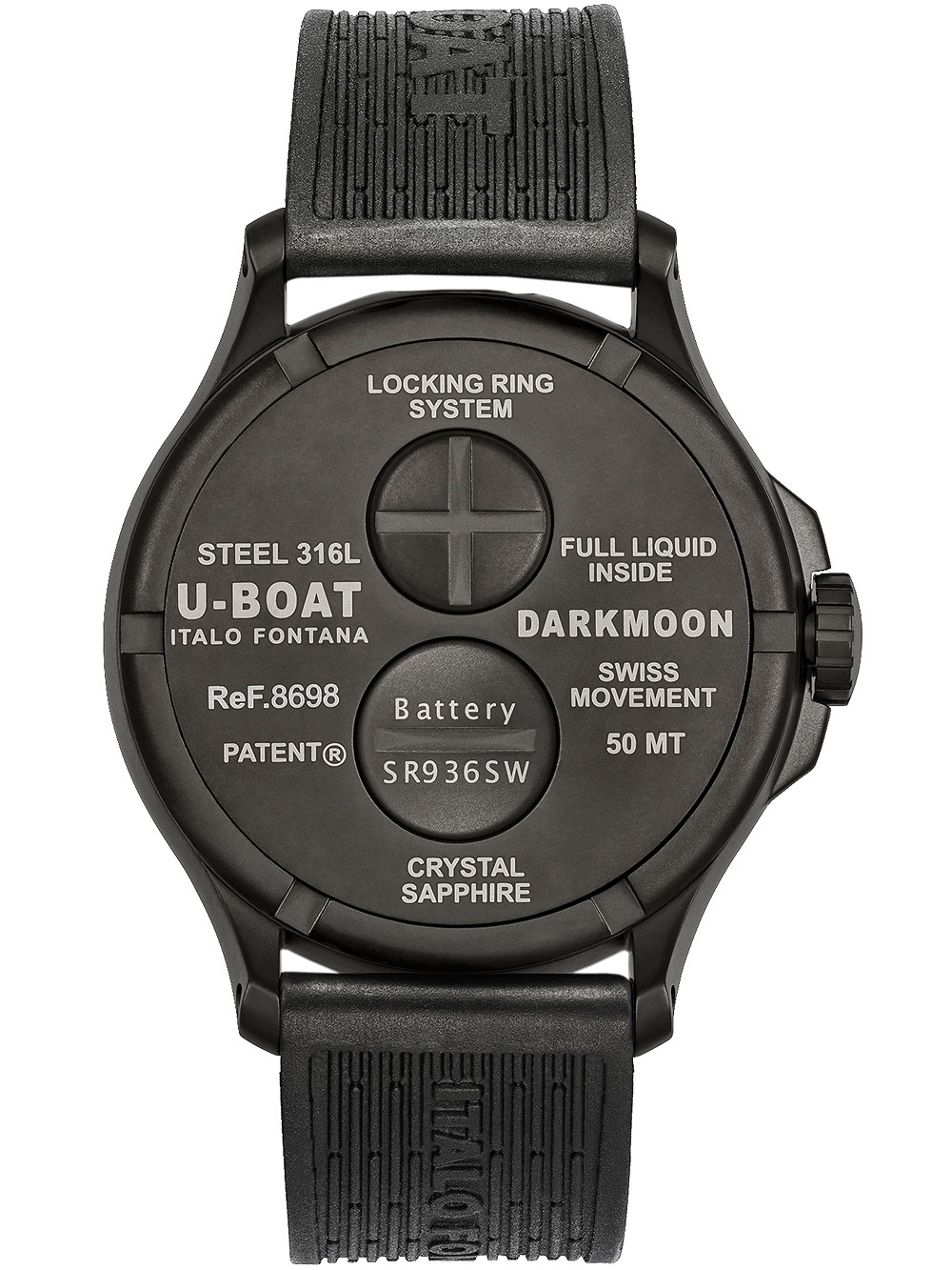 Brand: U-Boat • Manufacturer no.: 8698 • Manufacturer series: Darkmoon 44mm • Functions: Hour, Minute • Movement: Battery (quartz) • Movement label: Swiss Made • Dial color: Green • Display: Analog • Water resistant: 5 • Bezel: Fixed • Surface finish: Matted • Case color: Black • Case material: Stainless steel • Case thickness: 18 • Case width: 44 • Caseback: screwed, Stainless steel bottom • Gender: Mens • Crown: Screwed • Glas: anti-reflecting, Saphire glass • Lighting: Illumin. hands, Illumin. indexes • Style: Modern • Strap material: Caoutchouc • Strap color: Black • Lug width: 22 • Clasp: Buckle clasp • Max wrist circumferences: 220 • Item weight: 0.12