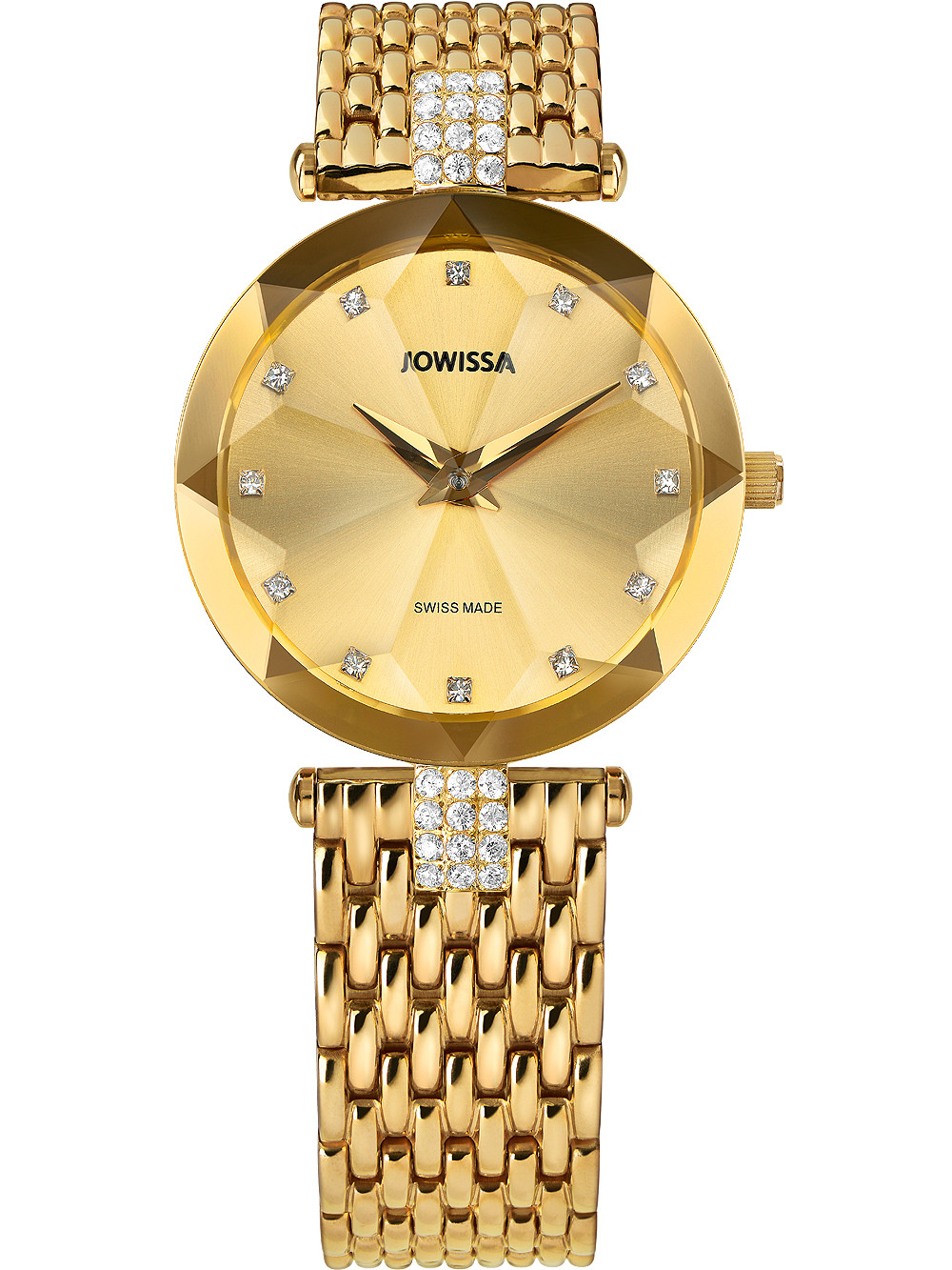 • Manufacturer no.: J5.629.M • Manufacturer series: Facet Strass 29mm • Functions: Hour, Minute • Movement: Battery (quartz) • Movement label: Swiss Made • Dial color: Golden • Display: Analog • Water resistant: 5 • Bezel: Fixed • Surface finish: Polished • Case color: Gold • Case material: Stainless steel • Case thickness: 9 • Case shape: Round • Case trimming: Zirconia • Case width: 29 • Caseback: pressed, Stainless steel bottom • Gender: Ladies • Glas: hardened, Mineral glass • Style: Elegant • Strap material: Stainless steel • Strap color: Gold • Lug width: 15 • Clasp: Clip clasp • Max wrist circumferences: 200 • Item weight: 0.06 • Scope of delivery: Box, Instruction, Packaging, Warranty documents