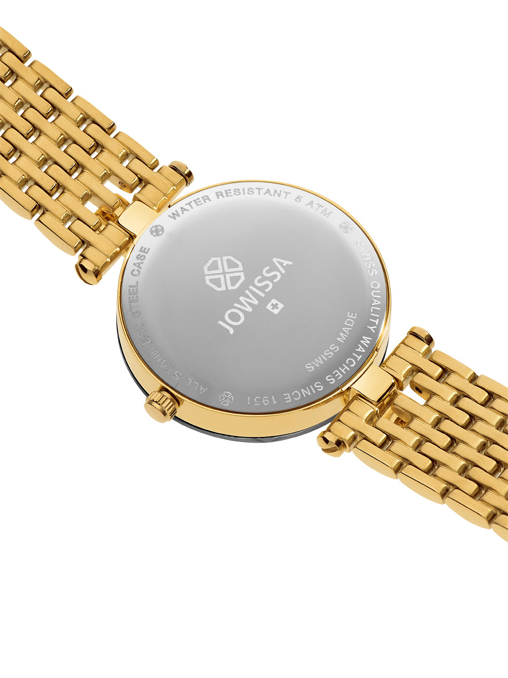 • Manufacturer no.: J5.630.M • Manufacturer series: Facet Strass 29mm • Functions: Hour, Minute • Movement: Battery (quartz) • Movement label: Swiss Made • Dial color: Black • Display: Analog • Water resistant: 5 • Bezel: Fixed • Surface finish: Polished • Case color: Gold • Case material: Stainless steel • Case thickness: 9 • Case shape: Round • Case trimming: Zirconia • Case width: 29 • Caseback: pressed, Stainless steel bottom • Gender: Ladies • Glas: hardened, Mineral glass • Style: Elegant • Strap material: Stainless steel • Strap color: Gold • Lug width: 15 • Clasp: Clip clasp • Max wrist circumferences: 200 • Item weight: 0.06 • Scope of delivery: Box, Instruction, Packaging, Warranty documents