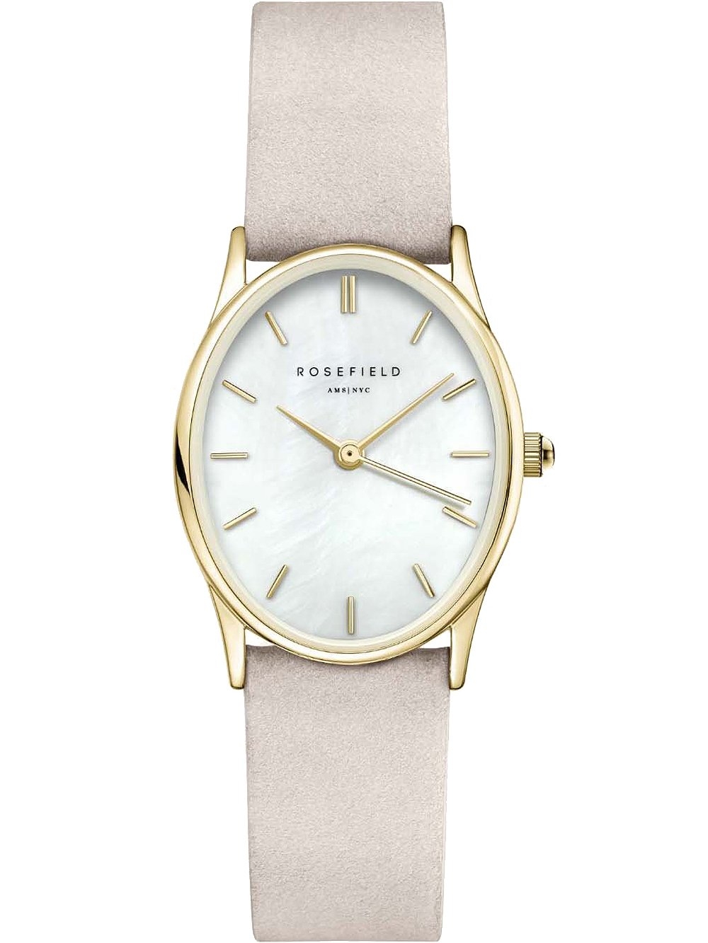 Brand: Rosefield • Manufacturer no.: OWGLG-OV05 • Manufacturer series: The Oval 24mm • Functions: Hour, Minute, Second • Movement: Battery (quartz) • Movement label: Miyota, GL32 • Dial color: Mother of pearl • Display: Analog • Water resistant: 3 • Bezel: Fixed • Surface finish: Polished • Case color: Gold • Case material: Stainless steel • Case thickness: 7 • Case width: 24 • Caseback: pressed, Stainless steel bottom • Gender: Ladies • Glas: hardened, Mineral glass • Style: Elegant • Strap material: Calf leather • Strap color: Taupe • Lug width: 14 • Clasp: Buckle clasp • Max wrist circumferences: 190 • Item weight: 0.02