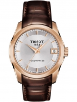 • Manufacturer no.: T035.207.36.031.00 • Manufacturer series: Powermatic 80 automatic 34mm • Functions: Date, Hour, Minute, Second • Movement: Automatic • Dial color: Silver • Display: Analog • Water resistant: 10 • Bezel: Fixed • Surface finish: Matted, Polished • Case color: Gold • Case material: Stainless steel • Case thickness: 11 • Case shape: Round • Case width: 34 • Caseback: Glas bottom, pressed • Gender: Ladies • Glas: anti-reflecting, Saphire glass • Style: Classic • Strap material: Calf leather • Strap color: Brown • Lug width: 18 • Clasp: Folding clasp • Max wrist circumferences: 185 • Item weight: 0.06 • Scope of delivery: Box, Instruction, Packaging, Warranty documents